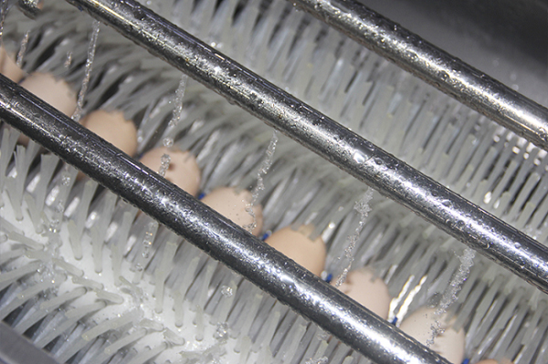 تم تصميم وحدة غسل البيض ثنائية المسارات لتقليل استهلاك المياه، حيث تستخدم 300 لتر فقط في الساعة (150 لتر لكل قناة). كما صُمم نظام الفرشاة من أجل تنظيف مثالي لسطح البيض، مع العلم أن سرعة الفرشاة قابلة للضبط بناءً على مستويات نظافة البيض لتقليل تلف القشرة. وهذا يحقق التوازن المثالي بين الحد الأدنى من استخدام المياه، وأقصى قدر من النظافة، والجودة العالية للبيض.