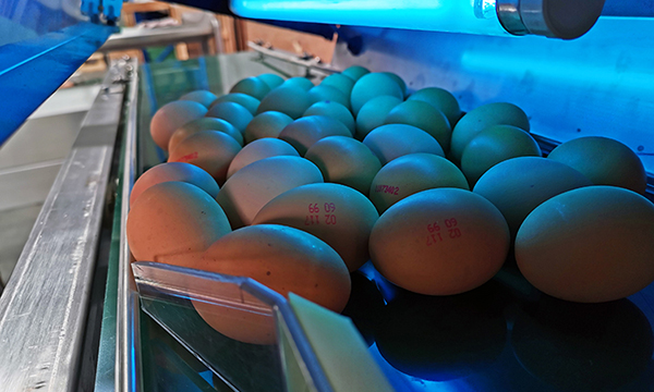 يقوم العمال بوضع البيض على خط التغذية الأحادي لماكينة غسل البيض يدوياً.